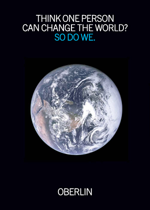The 1990s Oberlin recruitment poster with a photo of the Earth and a caption that read, “Think one person can change the world? So do we,” is why Katie McCall ’96 came to Oberlin. “Well, technically I went to Oberlin because it was a good school, but that poster really tipped the scale for me when I was making my final selection. I wanted to go to a school with people who looked around and thought, ‘We can do better than this, and I’ve got an idea how.’”