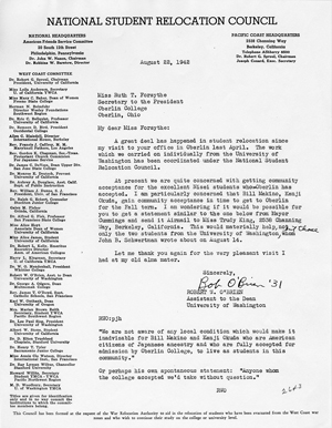 Oberlin president Ernest H. Wilkins sought to recruit Japanese American students even before the U.S. government-approved National Japanese American Student Relocation Council (NJASRC) was formed in late May 1942. Wilkins asked Harry Yamaguchi ’43, a sophomore at the time of the Pearl Harbor attack, to recommend other deserving Nisei. He also worked with officials at the University of Washington—which had a high number of American students of Japanese ancestry, corresponding often with its president, Lee Paul Siegand, and Robert O’Brien, an assistant to the dean of arts and sciences. O’Brien had earned a master’s degree at Oberlin in 1931 and had served on the Oberlin faculty before moving west. He was named chair of the Student Relocation Committee of the Northwest College Personnel Association in April 1942, which was formed to coordinate resettlement plans for students forced to leave the Pacific Northwest. O’Brien advocated on behalf of the students and navigated the labyrinth of administrative government and university paperwork required to coordinate Nisei student transfers.