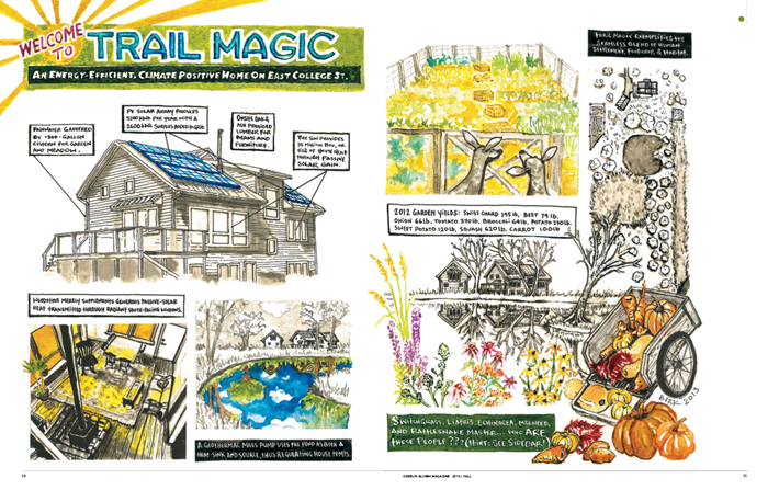 Aaron Birk ’01, an Asheville, N.C., artist who illustrated Bronx ecology and urban beekeeping in his 2012 graphic novel The Pollinator’s Corridor, to give our readers a close look at what makes the McDaniels’ house a net producer of energy, food, and well-being. Birk has two new books in the works—The Pollinator’s Corridor, Volume II and a graphic novel about southern Appalachia mythology and lore. McDaniel’s latest book, At the Mercy of Nature: Shackleton’s Survival Saga Gives Promise to Our Future, is due at the end of this year. For more information, visit his website.