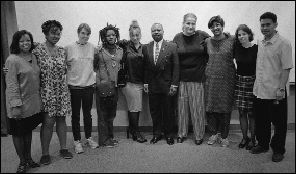 McNair recipients with the foundation's president. Left to right: Office of Undergraduate Research coordinator Che Gonzalez '96, Sarresa Richardson '99, Kathryn Roberts '99, Prentiss Slaughter '98, Samantha Sansevere '98, McNair, Monica Bielski '97, Aiha Ahmed '98, Susan Dennehy '99, and Jeff Cabusao '97.