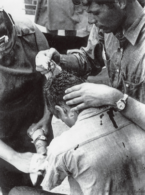 A work-in-progress, the Oberlin Civil Rights collection will continue to grow as it takes in and digitizes new material. Above, David Owen ’66 is tended to after he and other volunteers were beaten with steel rods while canvassing in Mississippi in 1964.