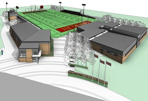 The athletics complex will replace the outdated football stadium with an all-weather, multipurpose field with lights and artificial turf, suitable for nearly every athletics team or club sport on campus. The complex will include a state-of-the-art press box, new grandstands for home and visiting spectators, and a new support facility with home and visitor locker rooms, as well as innovative meeting and social spaces available to the campus community.