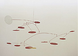 Yellow Among Reds, with its precisely balanced metal rods and flat circles painted in yellow, red, black, and white, is typical of Calder's many noncommissoned mobiles of the 1950s and '60s, although smaller than most. Its circular forms exemplify this period's return to the regular abstract shapes of his first abstractions, while its horizontal and broad structure, in contrast to the depth and near verticality of earlier mobiles, is also common in mobiles of the 1960s. 2