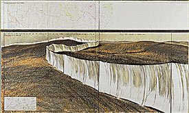 This two-part drawing is a preliminary study for Christo and Jeanne-Claude's monumental Running Fence (1972-76), a fabric curtain twenty-four and one-half miles long and eighteen feet high that linked the northern California town of Cotati at Highway 101 to the Pacific Ocean at Bodega Bay. With a pastel and charcoal rendering, topographical map, and technical details for one site on the Fence, the Oberlin drawing documents the long-planned, short-lived project.