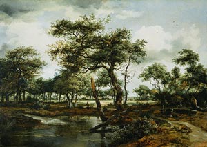 Almost without exception Hobbema's subject matter was drawn from the heavily wooded landscape of the eastern Netherlands. The majority of his paintings fall into the following categories: 1) dirt roads by farms in woods; 2) water mills near or set back into woods; 3) pools at the edge of woods, usually with farms or villages in the distance; and 4) ruins in woods. A Pond in the Forest belongs to the third category, but is unusual for the absence of any domestic architecture.