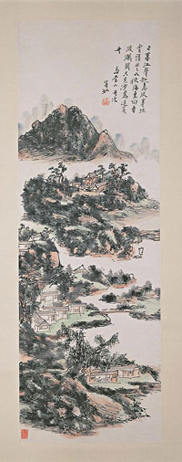 The cluster of rustic buildings beside a river in a mountainous landscape depicted in this scroll is one of the most traditional subjects in Chinese painting, with a history stretching back almost a thousand years. Yet the style of the painting--with its roughly sketched buildings, dense layers of ink and colors, and intimations of light and shadow--is thoroughly twentieth century. At a time when many Chinese artists were experimenting with folk art forms or Western painting styles, Huang Binhong continued to work with classical Chinese subjects and media, turning them in innovative directions. He is now recognized as having played a key role in the survival and vitality of traditional Chinese painting in the modern era.1