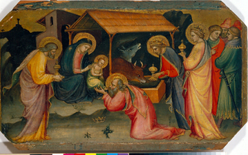 The Adoration of the Magi was recognized as the work of Mariotto di Nardo by F. Mason Perkins and Wilhelm Suida (in manuscript opinions) at the time of its purchase by the AMAM in 1943, an attribution that was subsequently confirmed by Marvin Eisenberg1 and Miklos Boskovits.2 The size, horizontal wood grain, and shape of the panel, which has been trimmed on all sides though not within the borders of the original picture field, indicate that it was painted as part of an altarpiece predella. Eisenberg correctly identified a panel representing the Adoration of the Shepherds3 (formerly in the Lanckoroncki Collection, Vienna), as a companion to the Oberlin panel and from the same predella. The original picture fields of the two panels are the same size and shape.4 Additionally, both panels preserve traces of identical punch patterns along the margins of their gold grounds and in the haloes of the principal figures, and are closely related to each other stylistically.