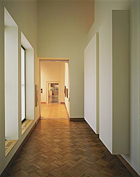 Distinctions between artwork and context all but disappear in Robert Irwin's Untitled, a permanent wall installation in the entrance corridor of the museum's Ellen Johnson Gallery of Modern Art. As its dimensions exactly repeat those of the deep-set windows just opposite, Untitled responds to the windows' voids with mass, shape, and relief, and a surface that absorbs the entering light.