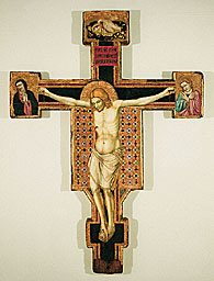 Scholars have yet to reach consensus over the authorship of the Santa Maria Novella crucifix. In the fifteenth century Ghiberti attributed it to Giotto, while Vasari, in the next century, assigned it to Puccio Capanna, a Giotto follower. Specialists have been divided ever since. Recently, Giorgio Bonsanti, director of the Accademia Museum in Florence, completed an extensive restoration and examination of the crucifix and concluded that it was painted by the hand of Giotto. For a review of the literature surrounding this work, see Francesca Flores D'Arcais, Giotto, trans. R. Rosenthal (New York, 1995), pp. 90-105.