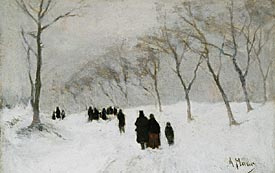 This modest winter scene, depicting a few huddled figures forging along a snowy path lined with insubstantial trees, typefies the reticent and meditative character of paintings by Anton Mauve. Mauve's mature works, such as Snow Storm, are delicate and lyrical; his subtle, almost monochromatic palette is suffused with a silvery light. Particularly between 1870 and 1885, Mauve and his colleagues in The Hague strove to realistically capture the muted, watery effects of the Dutch climate, and the endless interactions between land and sky. A contemporary critic described the atmospheric, tonal efforts of Hague School artists:1