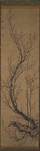 This dramatic image of a flowering branch sweeping upwards against the sky belongs to the genre of ink plum blossom (momei) painting. This genre was first established in China during the Song dynasty (A.D. 960-1279), where it was associated primarily with literati and Chan (Zen) Buddhist monk painters. It was probably through the latter artists that the style was transmitted to Japan, perhaps in the fourteenth or fifteenth century. This painting is stylistically similar to works by two famous Chinese ink plum blossom painters, Wang Mian (d. 1359) and Chen Lu (active ca. 1436-1449), and thus should probably be dated to the late fifteenth or early sixteenth century.1