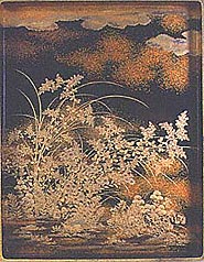 Primitive lacquering was known in Japan as early as the third century B.C., but did not develop into a significant art form until the introduction of Chinese lacquering techniques in the seventh or eighth century A.D. Japanese craftsmen quickly developed the art in new ways, and by as early as the tenth century A.D. a uniquely Japanese style of lacquer work had already appeared. The most distinctive characteristic of Japanese lacquers is the extensive use of the maki-e, or "sprinkled picture," technique. Maki-e lacquers are created by sifting powdered gold, silver, or copper through fine bamboo tubes onto a wet lacquer surface to create a design. Once the lacquer has dried, the design can either be polished flush with the surface of the vessel (hiramaki-e), built up with extra layers of lacquer and powders to create a relief effect (takamaki-e), or covered over with additional coats of lacquer which are then partially ground away to give the appearance of the design emerging from the surface of the vessel (togidashimaki-e).
