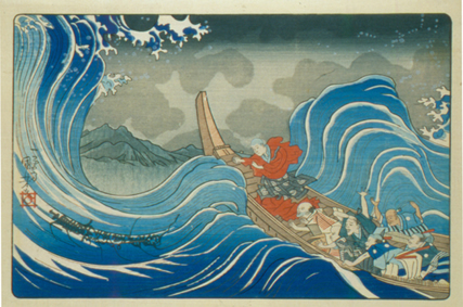 After Utagawa Kuniyoshi (Japanese, 1797 - 1861) The Sacred Mantram Appears to Nichiren in the Waves Off Sumida, mid 1830s Color woodblock print Overall: 10 1/8 x 14 1/4 in. (257 x 362 mm) Gift of Sarah G. Epstein (OC 1948), 1997 AMAM 1997.41.83