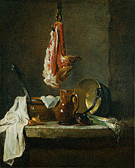 Still Life with a Rib of Beef embodies perfectly the subtle, understated nature of these profoundly simple pictures. The muted, almost monochromatic palette is offset by the red flesh of the hanging meat and the white napkin draped over the table edge at left. Several of the objects represented in the painting--the copper cauldron and the earthenware jug, the long-handled skimmer--appear in other, similar compositions by the artist. 1