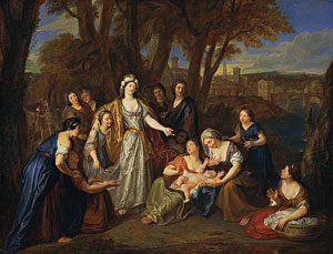 Coypel has not chosen the more commonly depicted moment of the subject, when the infant Moses is discovered at the edge of the Nile by the Pharaoh's daughter (Exodus 1), but the ensuing scene, when the princess, guided by Moses's sister Miriam, appoints his natural mother as his nurse (Exodus 2:1-9).