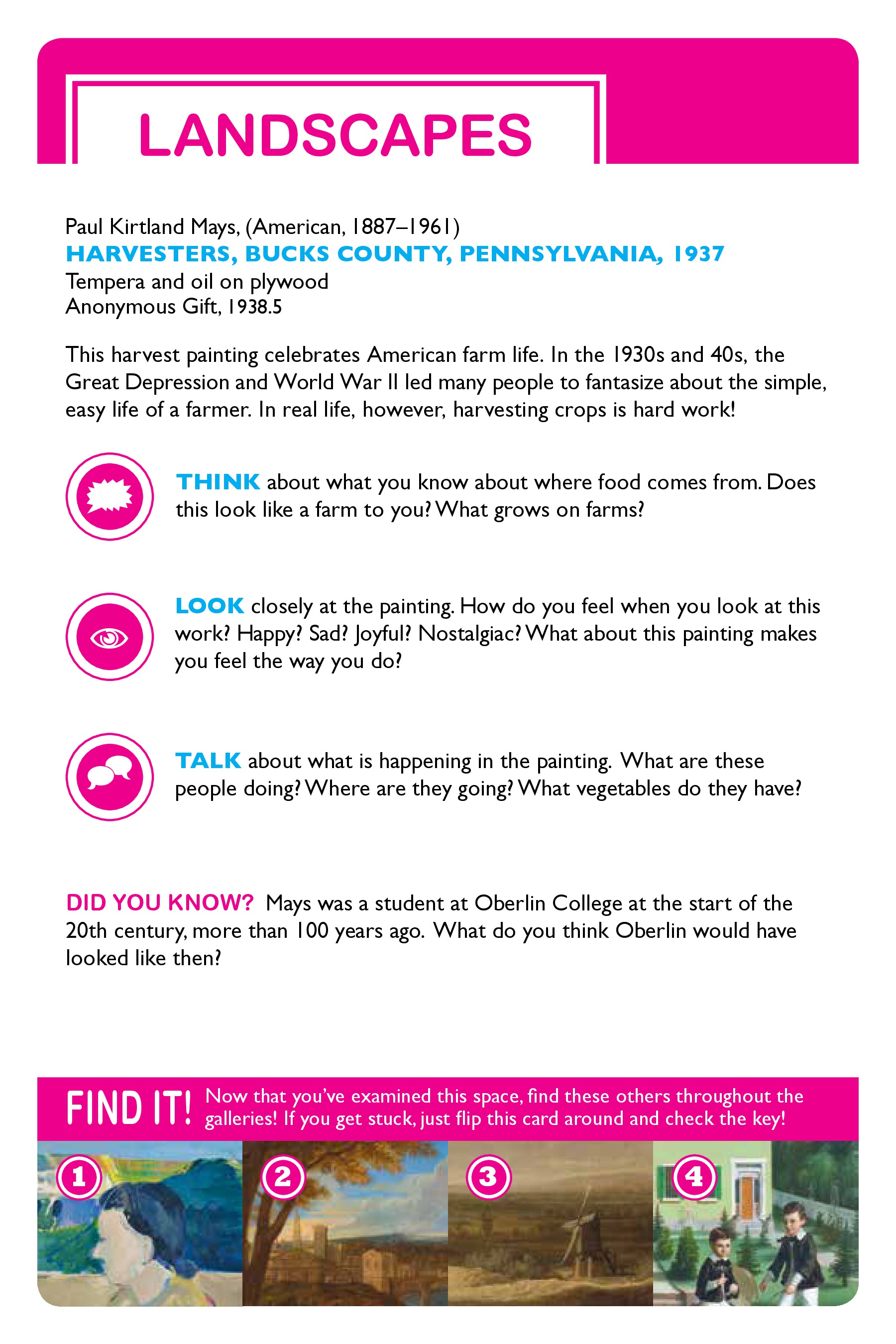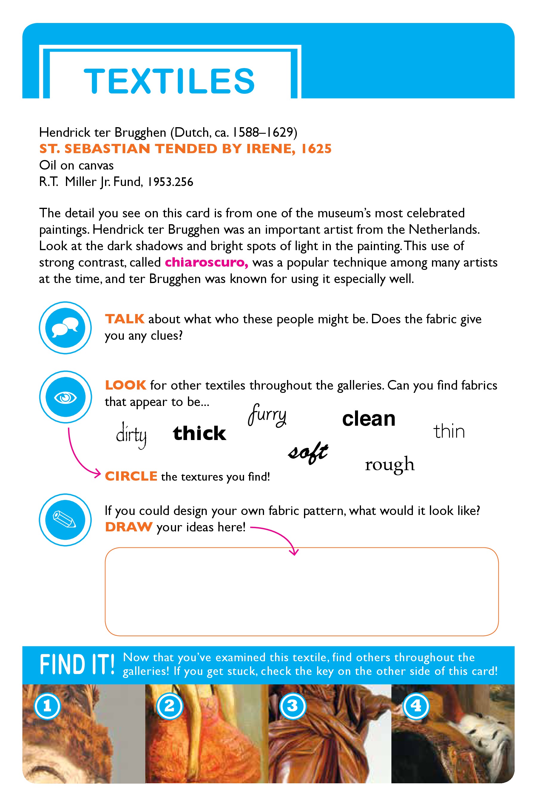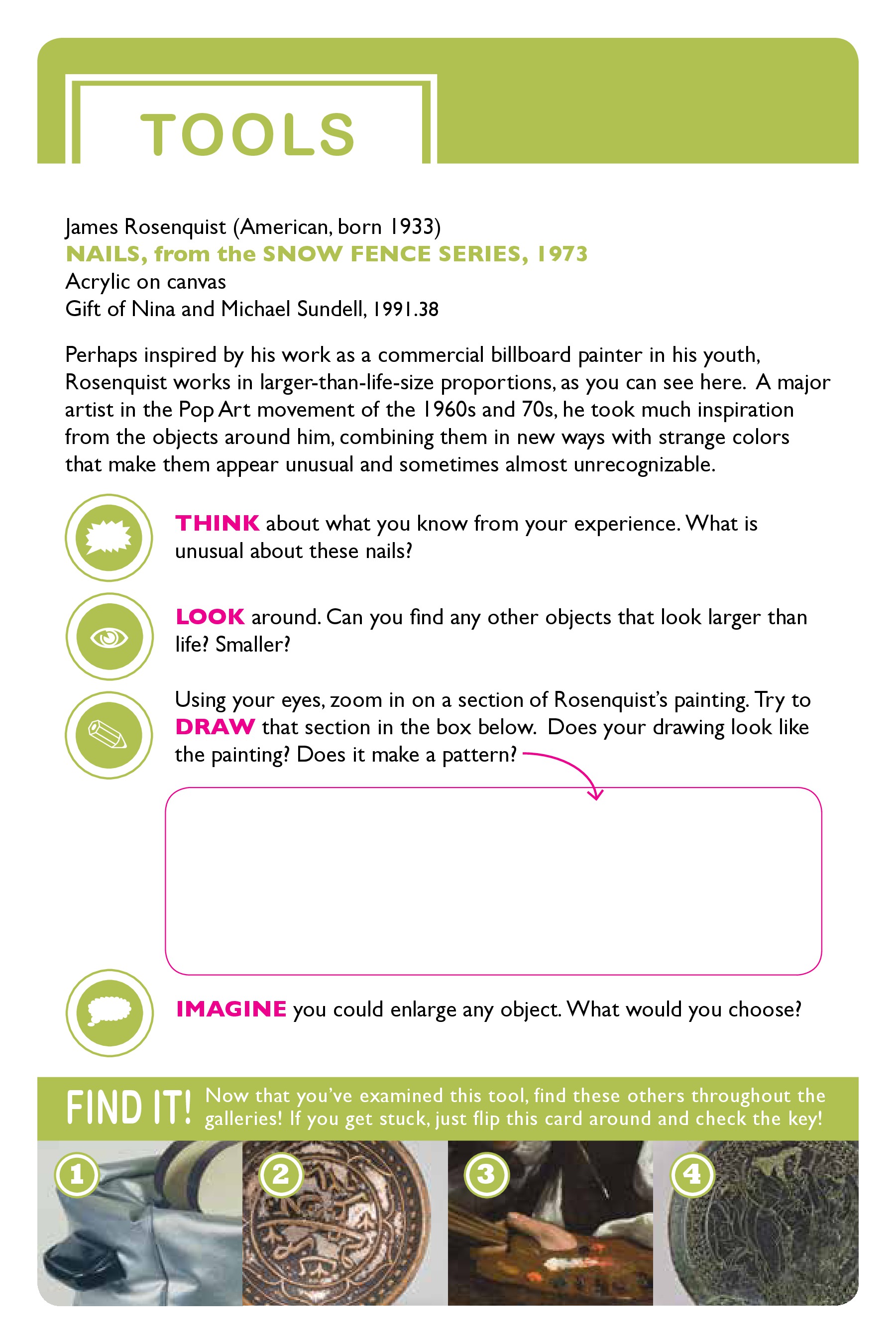 Six interactive family self-guides were created in connection with Realism exhibitions on view during the 2013-14 academic year. Topics included Landscapes, Cities and Towns, Tools, Patterns, and Textiles. The guides will suggest different ways to talk, look, imagine, draw, and think about these different concepts, and all guides include mini-scavenger hunts!