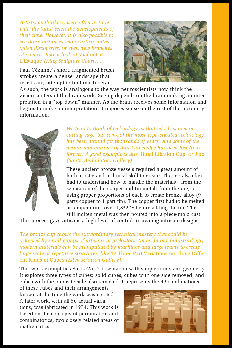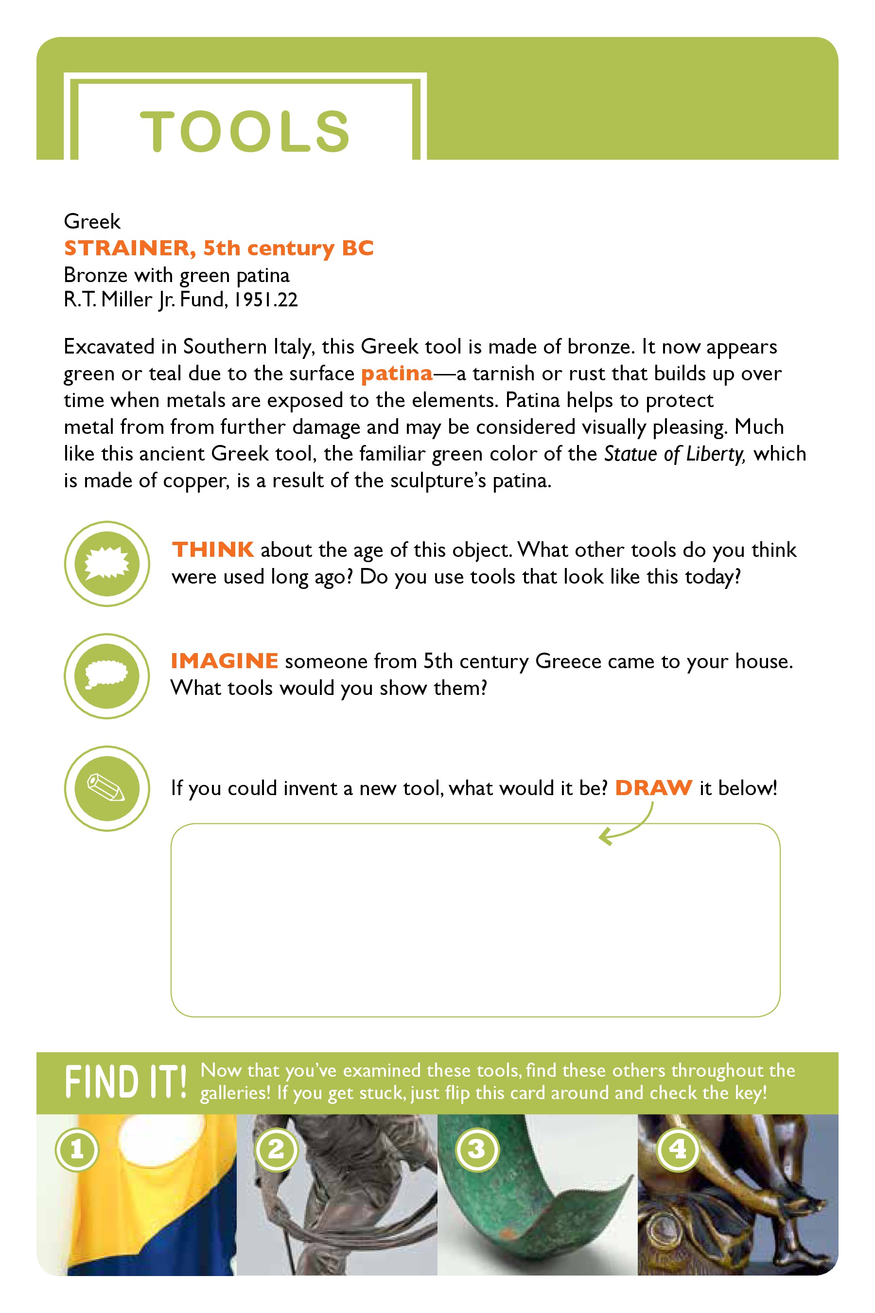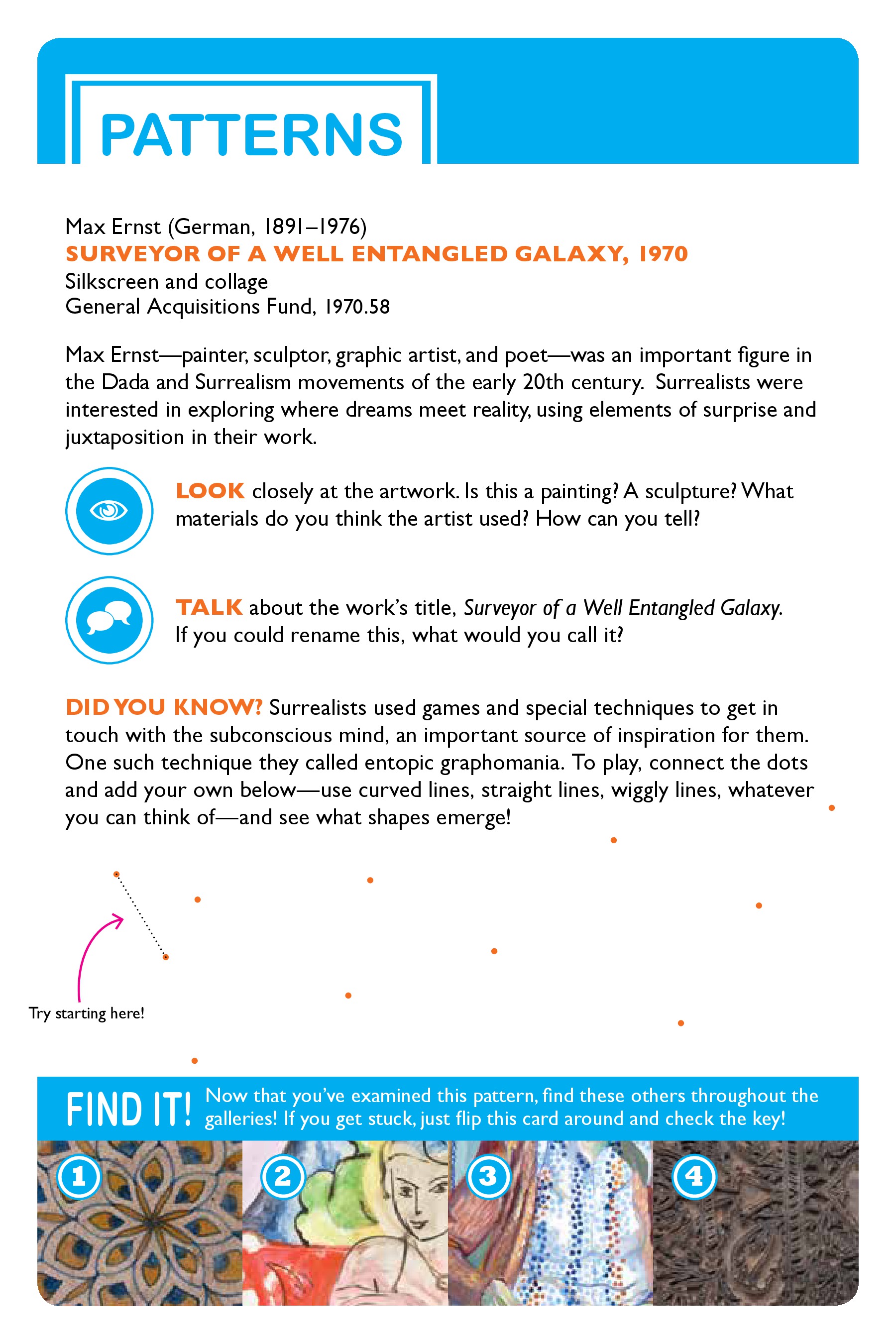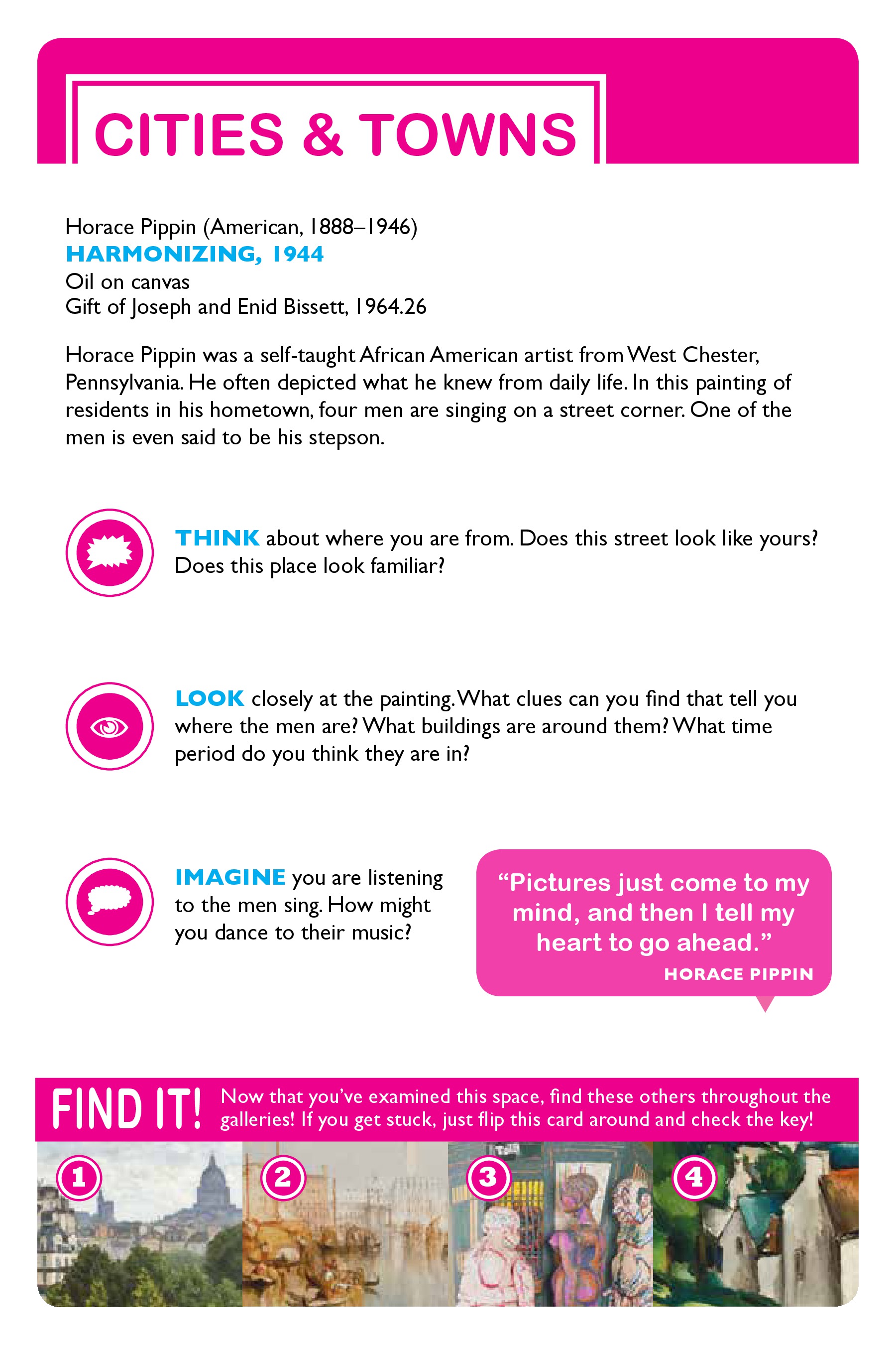 Six interactive family self-guides were created in connection with Realism exhibitions on view during the 2013-14 academic year. Topics included Landscapes, Cities and Towns, Tools, Patterns, and Textiles. The guides will suggest different ways to talk, look, imagine, draw, and think about these different concepts, and all guides include mini-scavenger hunts!