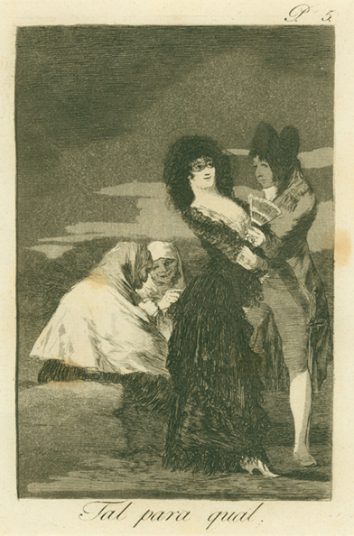Francisco José de Goya y Lucientes (Spanish, 1746 - 1828) Tal para Qual, 1799 Etching and aquatint Overall: 7 13/16 x 5 7/8 in. (198 x 149 mm) Plate: 7 13/16 x 5 7/8 in. (198 x 150 mm) Sheet: 12 3/16 x 8 7/16 in. (310 x 215 mm) Gift of Jane (OC 1957) and George (OC 1958) Hannauer, 2007 2007.15 |