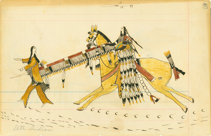 Howling Wolf (Southern Cheyenne, 1849 - 1927) 46. Ute Indian; 45. [blank page]; 27. [blank page]; 28. A Scout, 1874 - 1875 Pen, ink and watercolor on ledger paper Overall: 7 7/8 x 12 3/8 in. (200 x 315 mm) Gift of Mrs. Jacob D. Cox, 1904 1904.1180.11 |