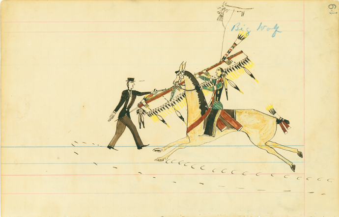 Howling Wolf (Southern Cheyenne, 1849 - 1927) 57. The warriors making their grand entry into the Medicine Lodge before beginning the dance. They fire first at the image hanging from the center pole. One band has just arrived and another is approaching the Lodge; 58. Two Horses; 63. [blank page], 1874 - 1875 Pen, ink and watercolor on ledger paper Overall: 7 7/8 x 12 3/8 in. (200 x 315 mm) Gift of Mrs. Jacob D. Cox, 1904 1904.1180.14 |