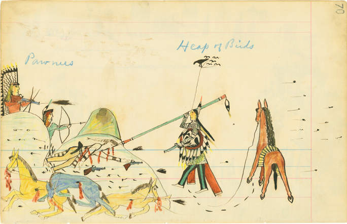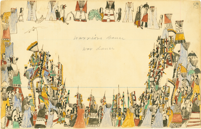 Howling Wolf (Southern Cheyenne, 1849 - 1927) 70. Pawnees, Heap of Birds; 69. [blank page]; 51. [blank page]; 52. Warriors Dance War Dance, 1874 - 1875 Pen, ink and watercolor on ledger paper Overall: 7 7/8 x 12 3/8 in. (200 x 314 mm) Gift of Mrs. Jacob D. Cox, 1904 1904.1180.17 |