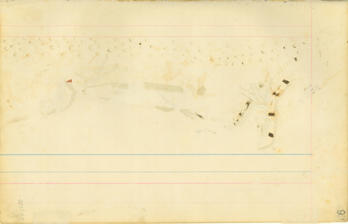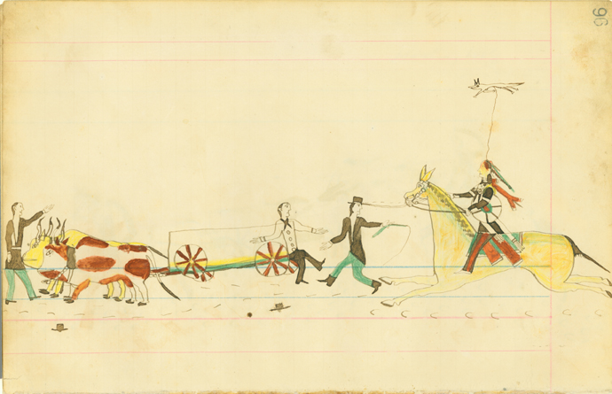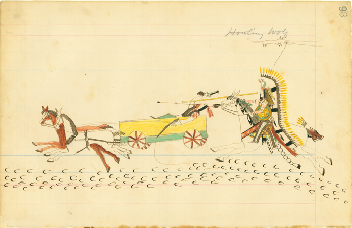 Howling Wolf (Southern Cheyenne, 1849 - 1927) 98. Howling Wolf; 97. [blank page]; 95. [blank page]; 96. Howling Wolf Capturing Three Soldiers, 1874 - 1875 Pen, ink and watercolor on ledger paper Overall: 7 7/8 x 12 3/8 in. (200 x 315 mm) Gift of Mrs. Jacob D. Cox, 1904 1904.1180.23 |