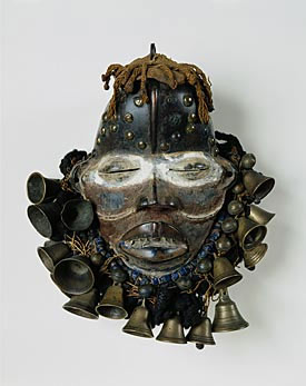 Artists primarily use the adze to carve masks, although chisels and knives may be used in the finishing stages. The final surface is achieved by rubbing the work with coarse leaves, then staining it with a particular plant's sap.The mask is in excellent condition with minor problems. Its earrings are missing, as are three of the forehead tacks; several of the latter show corrosion at the edge. At the back, two sections of the mask's rim have chipped off. Flaking of the kaolin in the eye area has occurred, and most of the reddish material applied to the cheeks (probably a mixture of camwood and chewed kola nut) has disappeared. Only traces of blue paint appear on the lower lip and chin. Some bells have lost their clappers, but others were made to be clapperless. The small piece of handwoven fabric which remains on the top of the head is discolored, its edges twisted and knotted.Through handling, a natural patina has developed on the lips, forehead, and nose ridge.