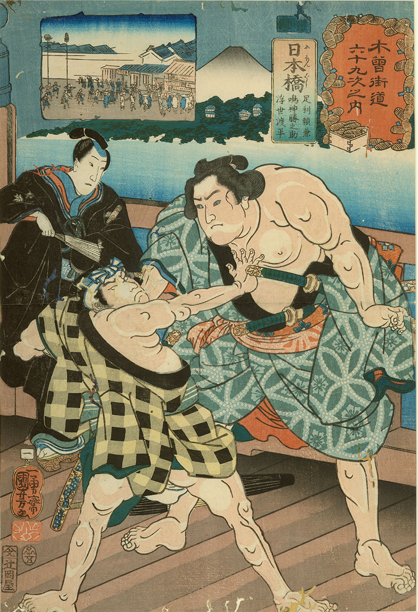 Image: Utagawa Kuniyoshi (Japanese, 1797–1861), "Nihonbashi: Ashikaga Yorikane, Narukami Katsunosuke and Ukiyo Watahei on Nihon Bridge, no. 1" from the series "The Sixty-nine Stations of the Kisokaidō," 1852, color woodblock print. Mary A. Ainsworth Bequest, 1950.589
