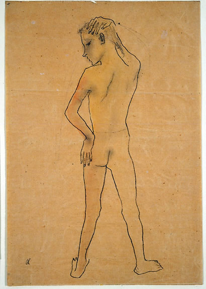 Oskar Kokoschka (Austrian, 1886 - 1980) Nude Youth Seen from the Back c. 1907 Pencil, light red and gray wash on tan-tinted paper Overall: 17 3/8 x 11 15/16 in. (44.1 x 30.3 cm ) Elisabeth Lotte Franzos Bequest, 1958 AMAM 1958.61