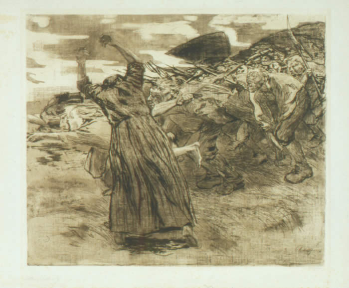 Kathe Kollwitz (German, 1867 - 1945) Outbreak from Bauerenkrieg, 1902 Etching and aquatint on paper Image: 19 1/4 x 22 3/4 in. (48.9 x 57.8 cm) Paper: 22 5/8 x 27 in. (57.5 x 68.6 cm ) Bequest of Mila A. Mitchell (OC 1949), 1996 AMAM 1996.6