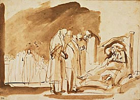 Horst Gerson was the first to identify the subject of the Oberlin drawing as the Raising of Tabitha.1 Distraught over the death of Tabitha (also called Dorcas), a Christian woman praised for her good works, the disciples of Joppa summoned Saint Peter to her deathbed. After hearing of her charitable deeds, Peter dismissed the mourners and knelt by the body to pray. He commanded Tabitha to rise, and accordingly she opened her eyes, sat up, and returned to the living (Acts 9:36-41). Sumowski has suggested that Koninck's sketch represents a slightly earlier moment in the narrative, specifically Saint Peter and the Christians of Joppa at Tabitha's Deathbed (Acts 9:39).2 The presence of a crowd of figures around the bearded Saint Peter (and the additional figures in the distance) supports this idea, but the minimal detail in the sketch precludes certain confirmation. The subject of Tabitha at her Deathbed, or the Raising of Tabitha, is rare in Netherlandish art, although it was treated twice by Rembrandt. His drawing of about 1654-55, representing the Raising of Tabitha, shows the saint kneeling alone at the deathbed;3 the other drawing, datable to 1662-65, depicts Peter sending the mourners from the room before beginning his prayers.4