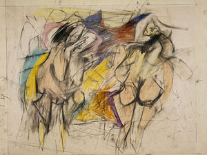 Many of the pastel drawings of 1952, including the Oberlin sheet, depict two standing women and refer back to one of the earliest stages of the painting Woman I, a seven-foot high drawing of two women produced by de Kooning during the summer of 1950. 2 That drawing, which consisted of two sheets of paper that de Kooning had attached to his painting wall, was destroyed in the course of his work on the painting.