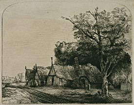 Many of Rembrandt's landscape etchings depict simple farmhouses and cottages engulfed by trees, within a typically flat, rural setting. The elusive effects of weather and atmosphere are enhanced through the use of varied printmaking techniques; here, drypoint accents create rich, dark shadows.