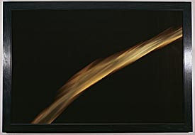 This large Cibachrome is essentially abstract and stark; the single mark of Serrano's ejaculate streaks in a whitish-violet arc with gold highlights across a black background.