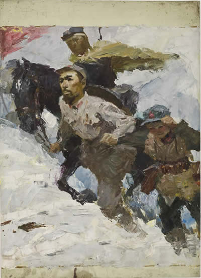 Shen Jiawei (Chinese, b. 1948) Sketch for Climbing Over the Great Snow Mountain, 1977 Oil on paper Image: 18 11/16 x 15 9/16 in. (475 x 395 mm) Sheet: 21 7/16 x 15 9/16 in. (545 x 395 mm) E. Rhodes and Leona B. Carpenter Foundation Fund, 2003 2003.13.2 |