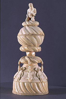 The Oberlin ivory is a lidded saltcellar, and it follows stylistic conventions for European metal cups of the period. Its basic ball-on-cone form is enlivened by two gadrooned knops; a third knop acts as cushion for a finial figure. Although these knops effectively imitate the forms of European lathe-turned ivories, they were hand carved. The gadrooning's strong curvature imparts a dynamic, spiraling movement that leads the eye up to the finial.
